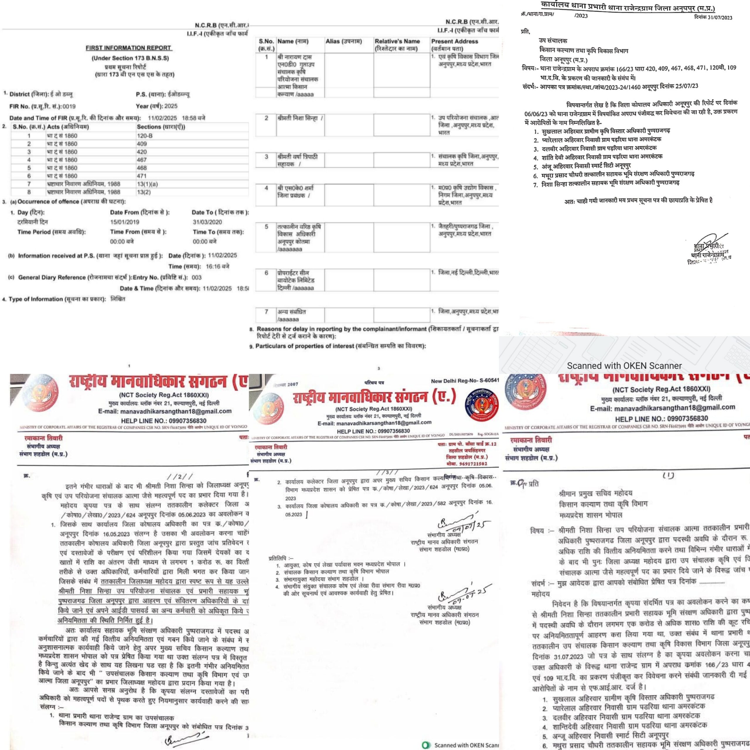 श्रीमती निशा सिन्हा उप परियोजना संचालक आत्मा तत्कालीन प्रभारी सहायक भूमि संरक्षण अधिकारी पुष्पराजगढ जिला अनूपपुर द्वारा पदस्थी अवधि के दौरान रू. लगभग एक करोड से अधिक राशि की वित्तीय अनियमितता करने तथा विभिन्न गंभीर धाराओं में एफआईआर दर्ज होने के बाद भी पुनः जिला अध्यक्ष महोदय द्वारा उप संचालक कृषि एवं जिला में उप परियोजना संचालक आत्मा जैसे महत्वपूर्ण पद का प्रभार दिये जाने के विरूद्ध जांच एवं कार्रवाई हेतु श्रीमती निशा सिन्हा तत्कालीन प्रभारी सहायक भूमि संरक्षण अधिकारी द्वारा पुष्पराजगढ जिला अनूपपुर में पदस्थी अवधि के दौरान लगभग एक करोड से अधिक शास० राशि की कूट रचित दस्तावेजों के आधार पर अनियमिततापूर्ण आहरण करा लिया गया था। उक्त संबंध में थाना प्रभारी थाना राजेन्द्रग्राम द्वारा ततकालीन उप संचालक किसान कल्याण तथा कृषि विकास विभाग जिला अनूपपुर म०प्र० को प्रेषित पत्र दिनांक 31.07.2023 जो पत्र के साथ संलग्न है का कृपया अवलोकन करना चाहेंगे जिसके आधार पर उक्त अधिकारी के विरूद्ध थाना राजेन्द्रग्राम में अपराध कमांक 166/23 धारा 420,409,4,468,471,1208 एवं 109 भा.द.वि. का प्रकरण पंजीकृत कर विवेचना करने संबंधी जानकारी दी गई थी, जिसमें निम्नलिखित आरोपितों के नाम से एफ.आई.आर. दर्ज है।