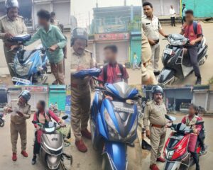 अनूपपुर। पुलिस मुख्यालय, मध्यप्रदेश भोपाल के द्वारा प्रदेश स्तर पर दिनांक 08.09.2025 से 22.09.2025 तक यातायात नियमों के उल्लघन कर्ता वाहन चालको के विरूद्ध 15 दिवसीय विशेष अभियान चलाया जा रहा है। उक्त अभियान के अंतर्गत पुलिस अधीक्षक अनूपपुर मोती उर रहमान के निर्देशन में थाना कोतवाली अनूपपुर पुलिस द्वारा सोमवार की सुबह नाबालिक बालको के द्वारा वाहन चलाये जाने का चेकिंग अभियान चलाया जाकर चालानी कार्रवाई की गई। थाना प्रभारी कोतवाली निरीक्षक अरविन्द जैन के नेतृत्व में सहायक उपनिरीक्षक कमलेश सिंह चौहान, आरक्षक अमित यादव, दिलीप कुमार एवं मोहित यादव की टीम के द्वारा नगर में संचालित विभिन्न विद्यालयों में वाहनों से आने जाने वाले नाबालिक छात्र छात्राओं की चेकिंग की गई। पुलिस द्वारा की गई चेकिंग के दौरान 6 ऐसे नाबालिक छात्रों के विरूद्ध मोटर व्हीकल एक्ट में चालानी कार्रवाई की गई जो कम उम्र के होने के उपरांत भी मोटरसायकल चलाते हुये पाये गये है। पुलिस द्वारा उक्त अभियान लगातार जारी रखा जायेगा। पुलिस अधीक्षक अनूपपुर मोती उर रहमान द्वारा छात्र छात्रओं के अभिभावकों एवं शैक्षणिक संस्थान के संचालको से अपील की है कि सड़क पर होने वाली वाहन दुर्घटनाओं से बचने के लिए अभिभावक अपने नाबालिक बालक अथवा बालिका को वाहन नहीं चलाने दे एवं यातायात के नियमों का पालन करें।